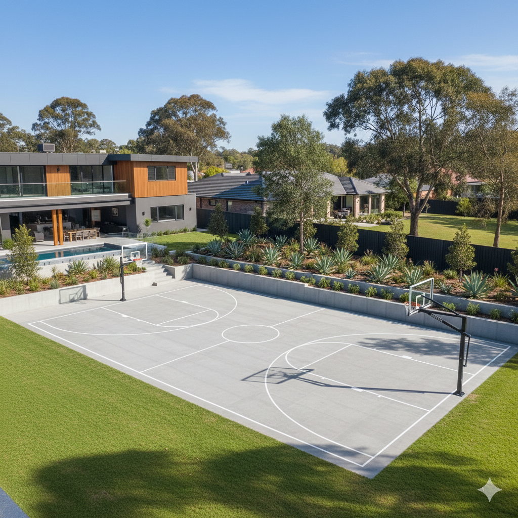 Reinforced Concrete: For residential and premium Council courts, we use SL82 or higher steel mesh reinforcement to prevent shrinkage and cracking.